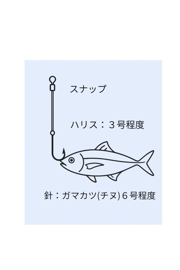 • ハリス:フロロカーボン3号程度、ナイロン5号程度・長さ1.5㍍〜2㍍