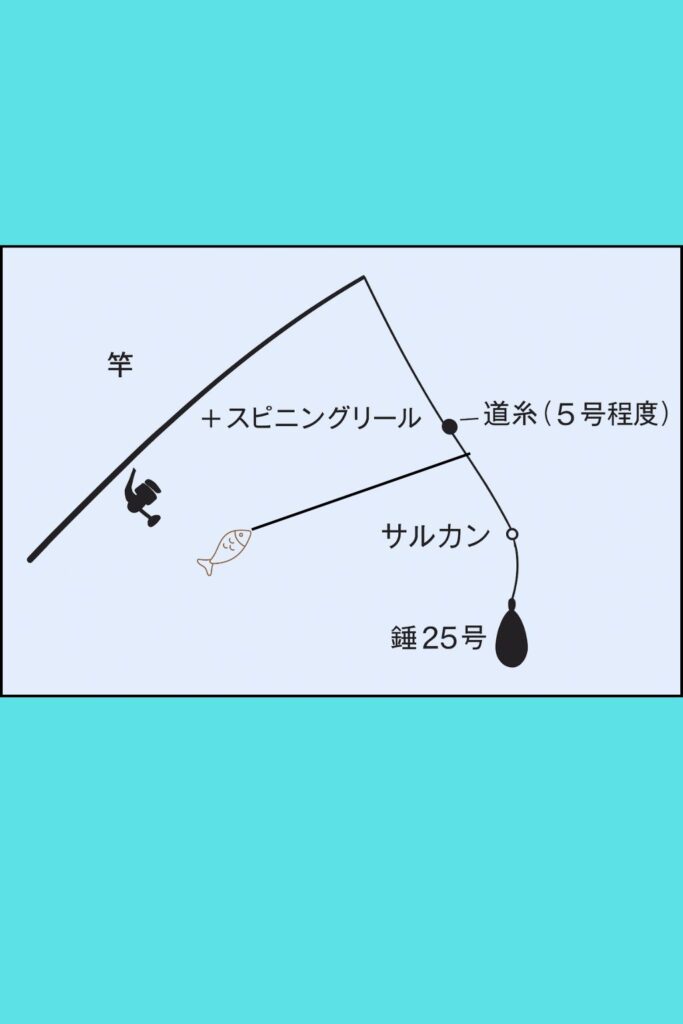 • 道糸の先端にサルカン(スイベル)、捨て糸、錘をつける※錘は潮で流されないような重さにすること※目安 25号程度
