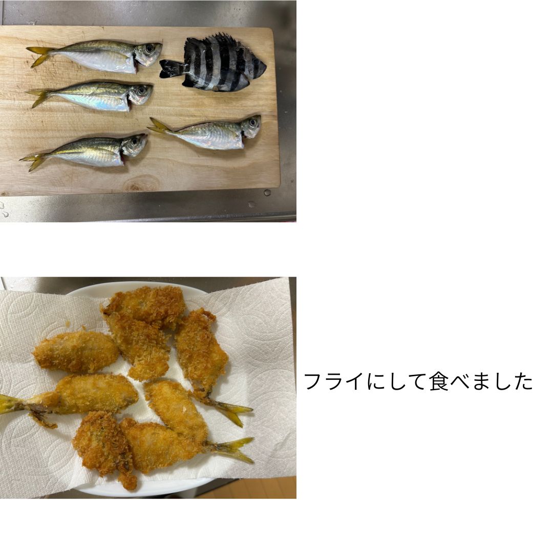 結果はアジが数匹、石鯛が1匹でした。近くでは穴子も釣れていました。餌は青イソメで投げ釣りだそうです。夜釣りの楽しみは竿先に鈴をつけ、真っ暗な場所で鈴の音を頼りに釣れることです。夜中よりも朝マズメにかけて釣れました。釣れた魚は持ち帰りフライにして食べました。朝はアジを餌に泳がせ釣りをしましたが、青物の回遊がなくあたりもありませんでした。